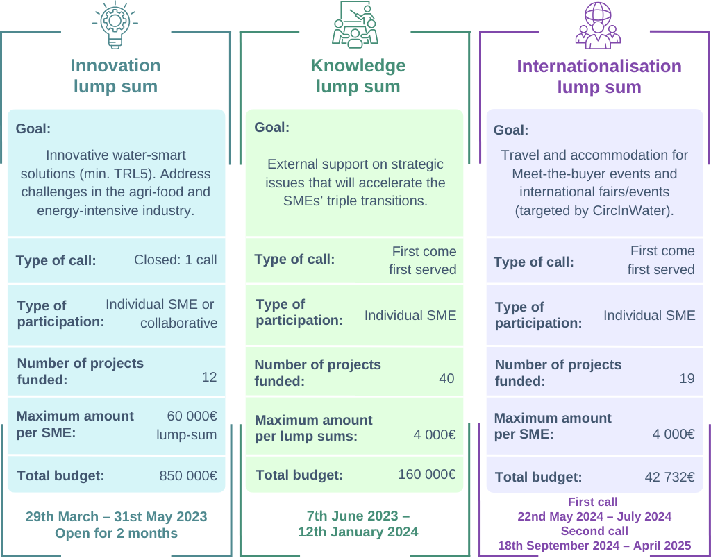 Para materializar este apoyo, CircInWater proporcionará apoyo financiero a las pymes que trabajan en el desarrollo de soluciones para la gestión del agua a través de un esquema de financiación que se organiza en tres esquemas diferentes: lump sum de innovación, lump sum de conocimiento y lump sum de internacionalización.